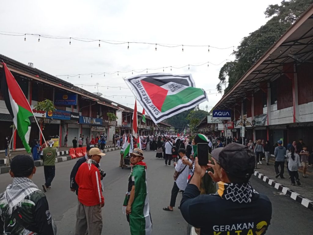 Acara peduli palestina yang di ikuti hampir 1000 masa dari berbagai element masyarakat dan Organisasi di awali dengan long martch dari depan Pendopo menuju Masjid Syiarul Islam .