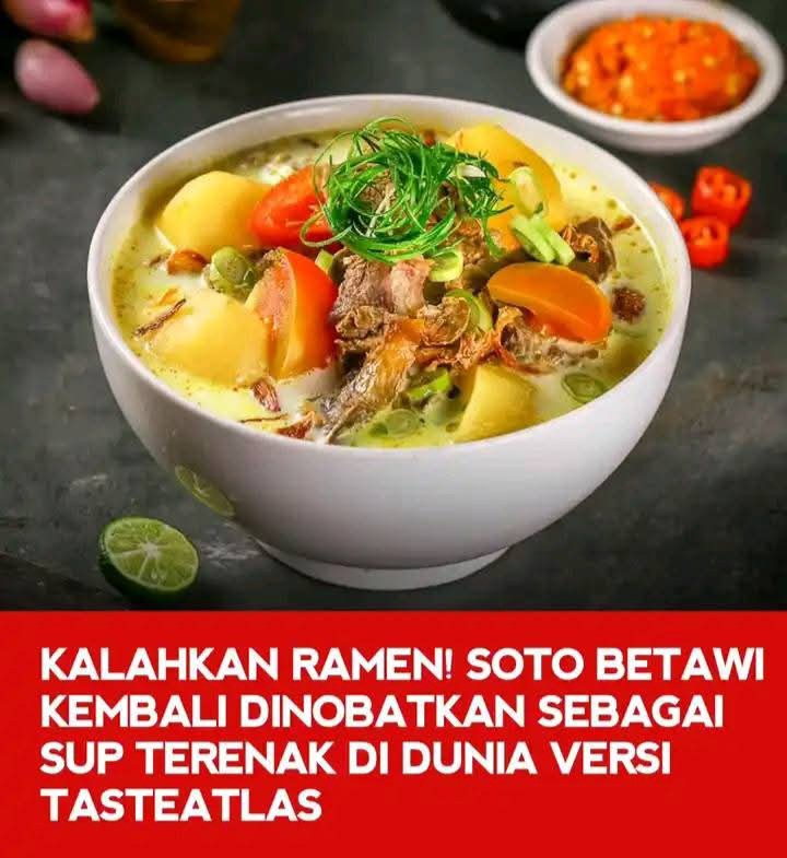 Dalam daftar 10 besar sup terenak di dunia, Soto Betawi mengalahkan sejumlah varian ramen terkenal dari Jepang, diantaranya miso ramen dari Sapporo, Yokohama-Style Ramen dan Tonkotsu Ramen.
